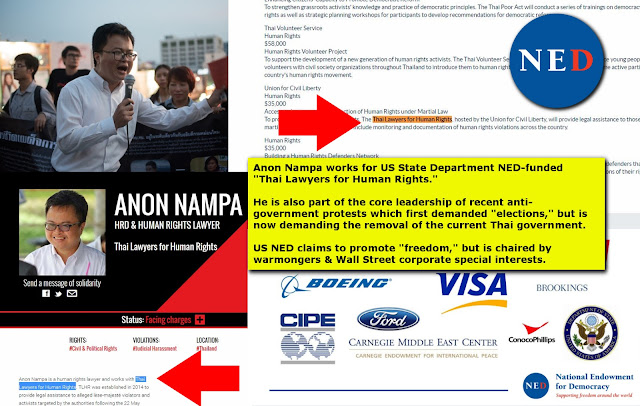 (2020-08-14). Thai PM Right to Question Protest Funding. thealtworld.com The notorious US National Endowment for Democracy (NED) is funding virtually every aspect of Thailand's current "student protests" aimed at removing current government. | Only through repetitive propaganda across the Western media and their local partners in Thailand can current protests appear "student led," "leaderless," and "organic." | An article published by the Bangkok Post titled, "PM: Who is financing student rallies?," would repeat Thailand's elected prime minister's questions, but Bangkok Post's reporters themselves have categorically failed to either ask or answer the same question. | Despite claiming…